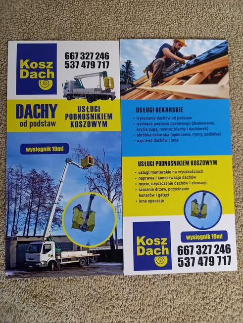Witam serdecznie oferuję budowę dachów od podstaw wszelkie Naprawy,obróbki, podbitki. Usługi z podnosnika koszowego ...